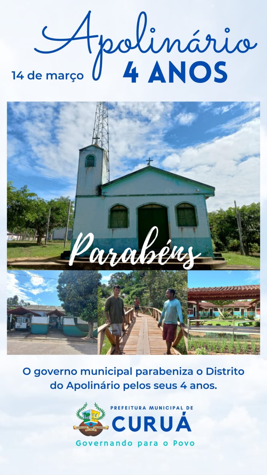 O Distrito Apolinário completa hoje, dia 14 de março, 4 anos de categoria de distrito. O governo municipal jamais poderia deixar de lembrar desta data tão importante para todos. Organizamos toda uma programação para o dia de hoje esperamos que as condições climáticas colaborem já que a chuva começou a cair desde a primeiras horas.